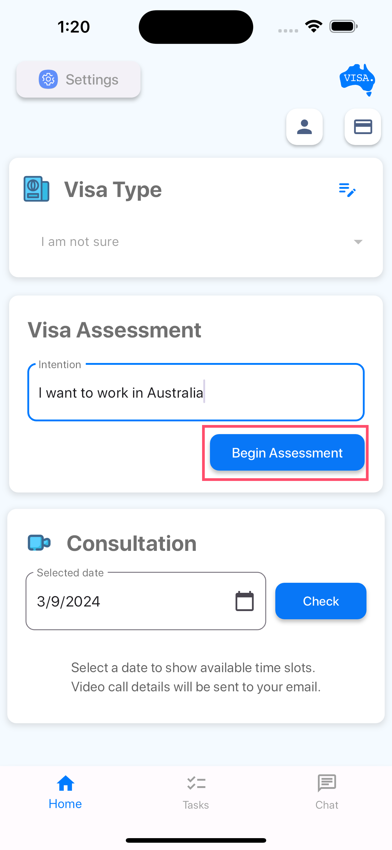 Once your profile is complete, you can get your visa score. Simply enter your reason for traveling to Australia, whether it's for a holiday, work, or study. Tap the "Begin Assessment" button after entering your intention. You can modify your intention at any time by using the "Modify" button.